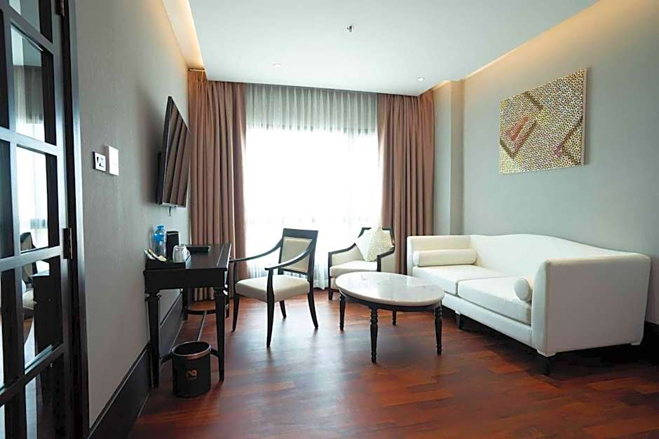 The spacious suite offers air conditioning, a mini-bar, as well as a private bathroom boasting a bath and a shower. The suite has parquet floors, a seating area with a flat-screen TV, a dining area, a wardrobe as well as city views. The unit has 1 bed.